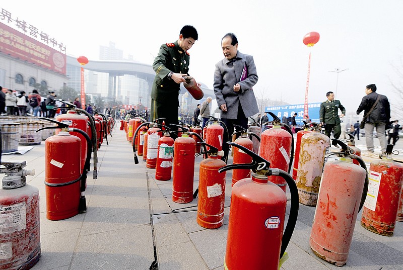 楚天都市报讯 昨日,我省暨武汉市消防产品打假启动仪式在光谷步行街广场举行,1000多件“山寨”灭火器、应急灯等消防产品被集中展示、销毁。消防战士还在现场指导市民如何识别灭火器的真伪。记者陈勇 汪亮亮 通讯员虞旻子 肖美刚 摄 |