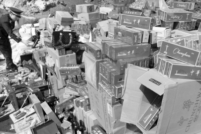销毁价值千万元假名牌,这对制假售假违法者将产生极大震慑。摄影记者季禾子 新商报讯(记者雷霆)今日下午,市公安局会同市工商局,集中销毁部分涉案假冒伪劣商品。其中有伪劣中华、玉溪、红塔山、红双喜等十余个品牌卷烟50余件(箱)2530余条,假冒茅台、五粮液等名牌假酒及酒瓶、包装物279(瓶)件,假冒劣质化妆品1477件(箱),假冒品牌服装及假冒LV箱包321余件,汽车配件164件,电池和办公用品612件,劣质食品5700余斤,调味品36箱(件),这次集中销毁的部分涉案假冒伪劣商品总价值1230余万元。 |