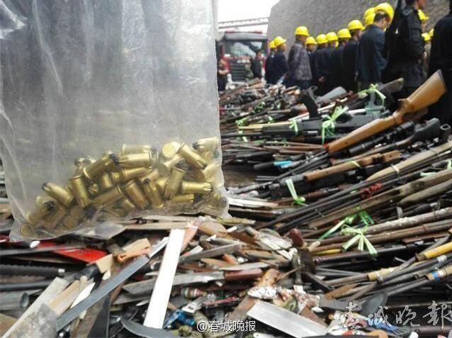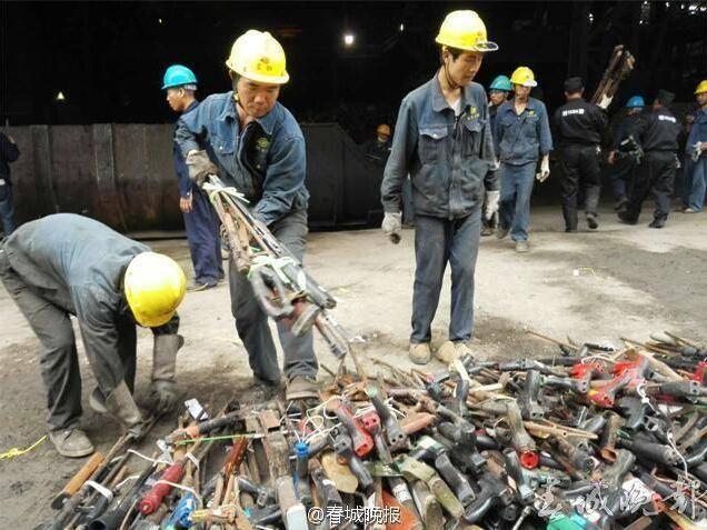 现场各类枪支1108支、各类子弹6015余发、管制刀具2872把、炸药6.8万余公斤、雷管10万余枚、索类爆炸物品3.9万余米,都被送进上千度的高温熔炉,瞬间化为红红的铁水。