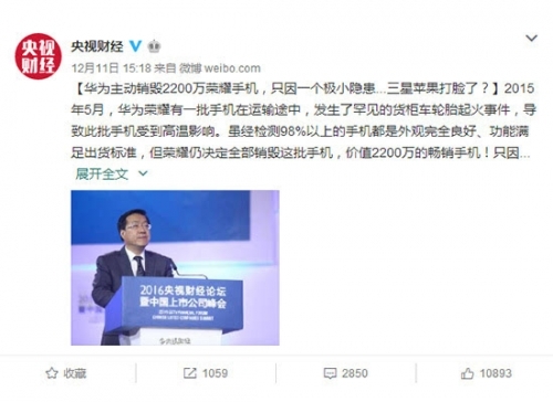 今年可谓是手机圈的多事之秋,现有三星因为Note7爆炸备受影响,在下半年市场上失去了主动权,后又有苹果iPhone异常关机事件闹的沸沸扬扬,在日前举行的2016央视财经论坛上有消息称,为了防止极小的隐患发生,华为主动销毁价值2200万元的荣耀手机。