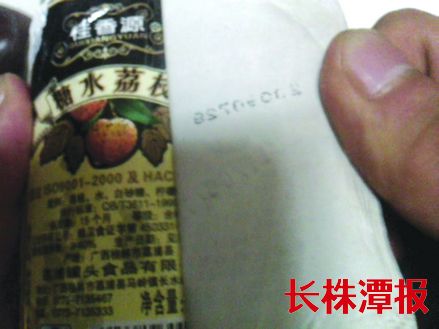 方先生告诉记者,他在市内多家大型超市都看到了这种篡改生产日期的“桂香源”荔枝罐头,除了“双标签”外,还有一种就是“改日期”,即擦掉原有日期,标上新的生产日期。
