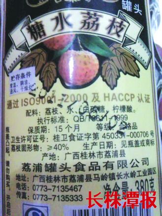 8月9日,市民方先生给记者看了他在超市买到的这种“双层标签罐头”,还拿出了当时的购货小票。记者拿起罐头看了看,这瓶“桂香源”糖水荔枝罐头颜色发黄,罐头水浑浊,看上去并不新鲜,但其标签上的生产日期为2011年6月2日,还标明了生产厂家、卫生许可证号、食品质量安全标志。