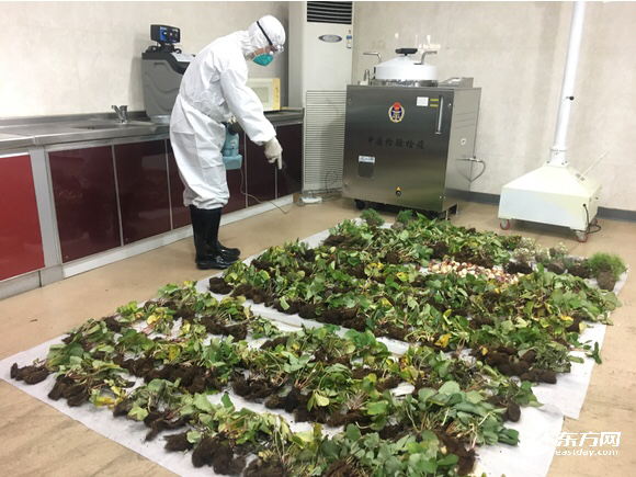 东方网记者在集中销毁现场看到,非法进境的种苗种类繁多,有各种多肉植物、草莓种苗、富贵竹、郁金香种球等等。据上海检验检疫局动植物与食品检验检疫技术中心的叶军研究员介绍,进境种苗往往携带土壤,并可能传带各种有害生物,例如今年从日本进境的柏树、枫树、苹果树等种苗中多次检出检疫性的朱顶红短体线虫,从各种香料和豆类种子中检出鹰嘴豆象、四纹豆象、具节山羊草等检疫性昆虫和杂草。