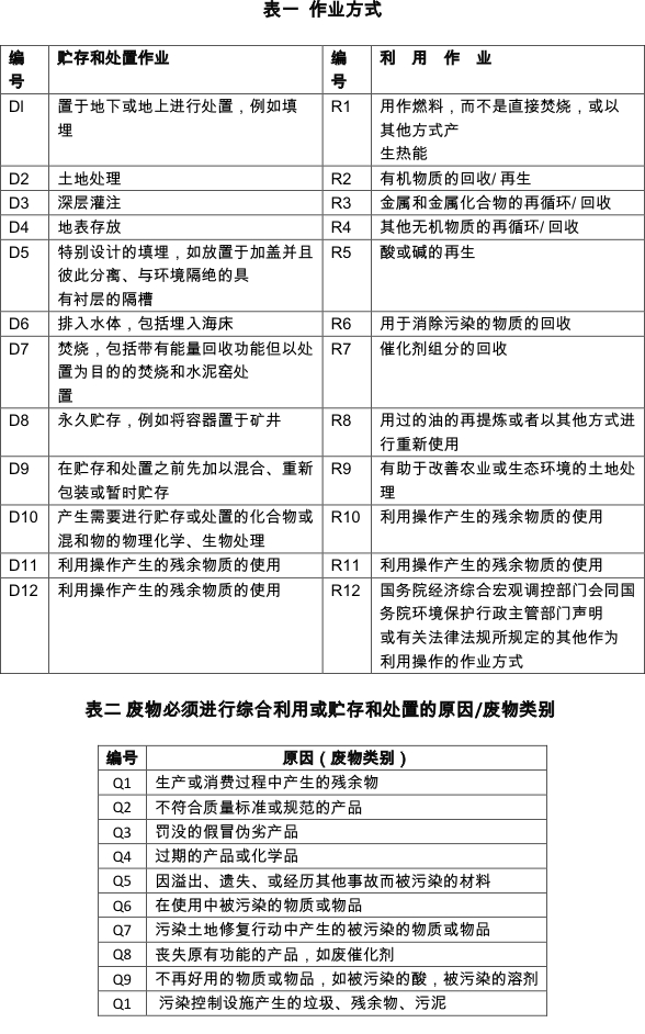 根据表一所列作业方式和表二所列原因进行判断。如果一个物质、物品或材料必须以表一中列出的作业方式进行处理,并且满足表二中列出的一个或多个原因,可判断为固体废物。表一与表二必须结合使用,不能单独用于固体废物的鉴别。