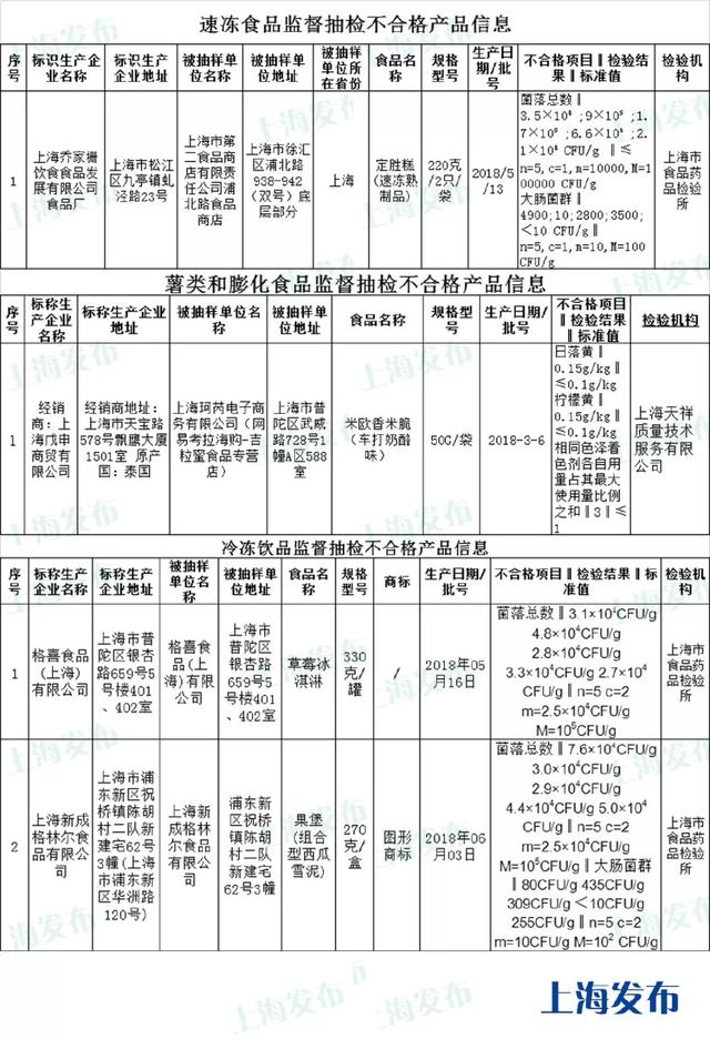 不合格食品信息 ![]() 本次公告的监督抽检信息涉及9大类食品,包括:饼干、罐头、冷冻饮品、速冻食品、薯类和膨化食品、糖果制品、茶叶及其相关制品、酒类、蔬菜制品等。抽检样品共计870批次,其中合格866批次、不合格4批次。不合格样品为冷冻饮品2批次(不合格项目:菌落总数、大肠菌群),速冻食品1批次(不合格项目:菌落总数、大肠菌群),薯类和膨化食品1批次(不合格项目:日落黄、柠檬黄),样品信息详见附件。