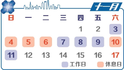 2019年11月5日将在上海举行进口博览会。《通知》规定,将11月5日(周一)调整为休息日,相应将11月3日(周六)调整为工作日;将11月6日(周二)调整为休息日,相应将11月11日(周日)调整为工作日。除保障进口博览会举办、重大活动、城市运转等必要的工作岗位外,本市机关、事业单位(包括学校)和社会团体按此执行。证券交易机构正常运行,不做调休。企业和其他单位可根据实际情况,自行安排。