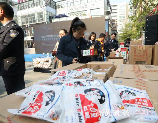 ![]() 图说:活动现场销毁了一大批假冒品牌调味品、白酒、奶糖等。新民晚报记者 张龙/摄