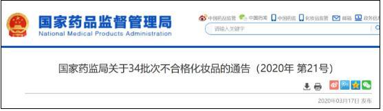 2020年3月17日,国家药品监督管理局网站发布关于34批次不合格化妆品的通告(2020年 第21号).