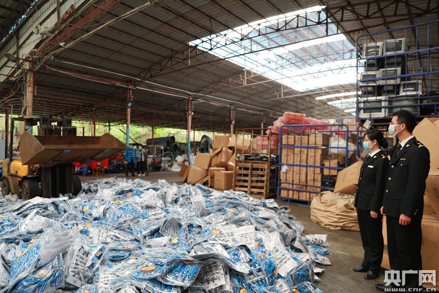 广州海关所属南沙海关关员现场监督侵权货物销毁。(央广网发 马寅栋摄)