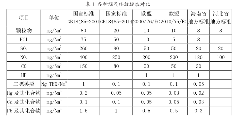垃圾在焚烧过程中会产生危害环境的烟气,烟气成分复杂,包含HCI、SO2、HF、NOx、二噁英、Pb、Cd、Hg等多种组分。目前国内焚烧厂主流烟气净化采用“SNCR+半干法脱酸+干法+活性炭喷射+布袋除尘器”处理工艺。我国垃圾焚烧发电厂烟气排放执行GB18458《生活垃圾焚烧污染控制标准》,该标准2014年重新修订,现阶段我国焚烧厂烟气排放执行GB18458-2014标准。部分大气环境承载力不高和经济发达地区,采用更为严格的地方标准、欧盟标准(EU2000/76/EC)或欧盟2010标准。