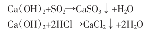 半干法是通过喷水量控制反应温度,在合适的温度消石灰浆液与酸性气体反应,脱除烟气中的酸性成分。旋转喷雾半干法将石灰浆液通过塔顶的高转速旋转雾化器进行雾化,石灰浆液被雾化成粒径30um~50um左右的雾滴,细小的雾滴与酸性气体充分接触,在一系列的化学反应后去除烟气中绝大多数的酸性气体;在反应过程中,雾滴吸收烟气中的热量不断蒸发水分,结合脱酸塔的独特设计,塔内的高温烟气使得浆液雾滴在下降的过程中得到干燥,并在到达塔底前将水分充分蒸发,形成固体反应物从塔底排出。其化学反应如下: