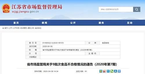 2020年4月8日,江苏省市场监督管理局发布关于9批次食品不合格情况的通告(2020年第7期)。据通告,近期,江苏省市场监督管理局完成省级食品安全监督抽检任务458批次,涉及方便食品、肉制品、炒货食品及坚果制品、酒类和糕点等食品。根据食品安全国家标准检验和判定,其中抽样检验项目合格样品449批次、不合格样品9批次。