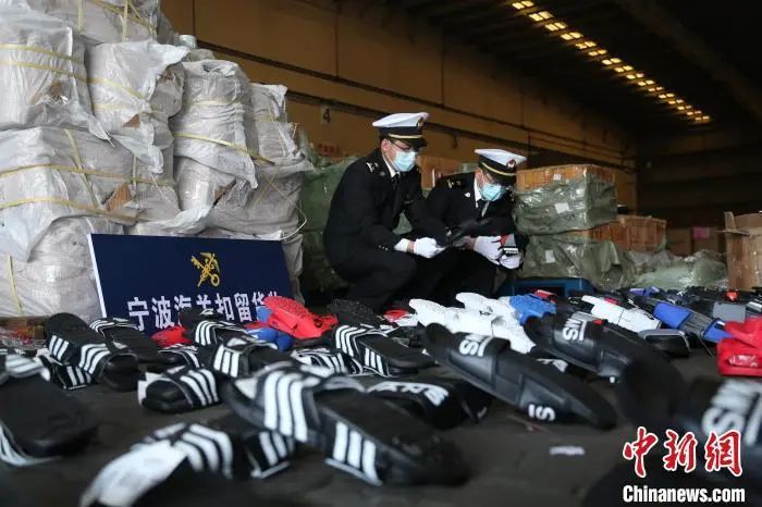 无独有偶,一批印有“NIKE”“LV”“GUCCI”等十余种知名品牌的塑料拖鞋也引起了宁波海关查验关员的注意。“这批塑料拖鞋涉及品牌众多,材质粗糙,而且有轻微的刺激性气味,显然不符合正品的特征。”海关查验关员说。