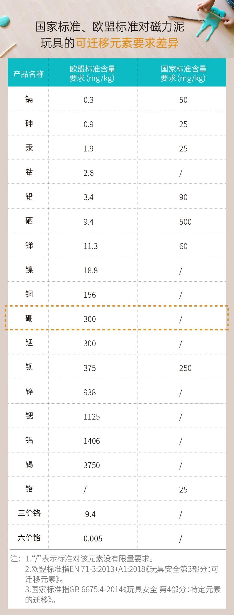 由于国家标准GB 6675.4-2014《玩具安全 第4部分:特定元素的迁移》对硼元素没有进行限量要求,风险监测为了帮助发现问题,推动有关标准设立和修订,提高产品质量水平,因而采用了较严格的欧盟标准进行了此次风险监测。