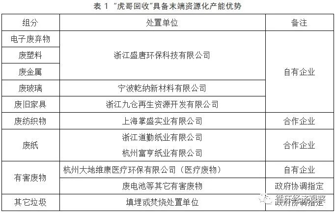 “虎哥”模式下,居民只需对垃圾进行干、湿分类,将干垃圾放在“虎哥回收”专用垃圾袋中,即可以通过虎哥回收APP、虎哥回收微信号、400热线电话、服务站服务电话、虎哥回收官方网站五种方式预约“虎哥回收”上门提供垃圾收集服务,所有垃圾专用袋上均贴有二维码,用户信息、垃圾重量等可以实时录入监管系统;收集完成后,居民可按每公斤干垃圾0.8元的价格获得环保金收入,环保金可用于在虎哥商城或者“虎哥回收”服务站兑换商品。从居民处收集的垃圾每日将被清运至“虎哥回收”总仓,集中进行二次分拣,按照末端处理的需求做精细化分拣。公司二次分类类别达40余个,使得可回收物的再利用价值最大化,回收的垃圾中有98%以上都进入下游再生资源利用企业,只有不足2%的干垃圾进入焚烧厂。