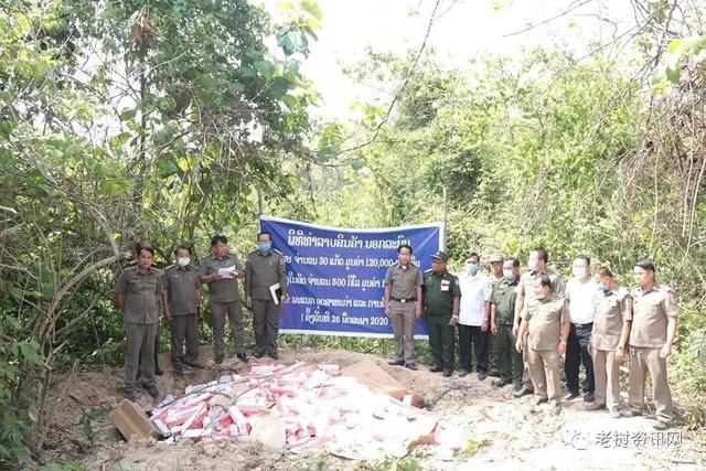 2020年5月26日在第497团营地,万象市工贸厅举行了销毁非法进口烟草和动物内脏的仪式,此次参加仪式的有万象市工贸厅副厅长南达·洒努翁先生,对内商贸司代表,万象市卫生厅以及相关部门。