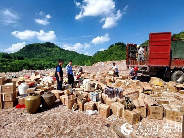 近日,贵州铜仁碧江警方在一渣土处理场销毁贵州茅台酒等涉案价值1000余万元的假冒伪劣产品。 贵州茅台酒、贵州习酒、Vivo牌充电宝及手机配件等,在推土机的碾压下,粉身碎骨,现场酒香四溢,酒香味久久不散。约两个小时后,这些假冒伪劣产品全部与渣土混合在一起,成为垃圾。