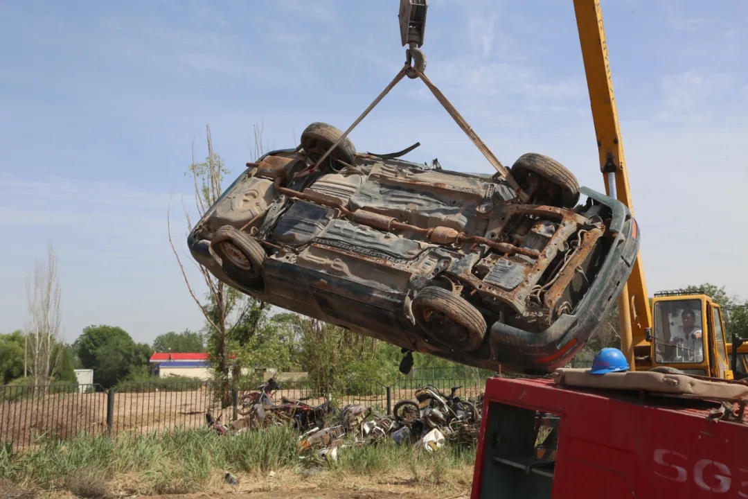 6月12日,在利通区九公里报废车辆集中销毁现场,记者看到,伴随着工程机械的轰鸣声,一辆辆报废车被压扁成了铁饼,两台工程车加大油门用铲斗砸向报废车辆,随着“砰”的一声巨响,报废车辆顶棚被砸变形,车窗玻璃碎片四溅,变成一堆堆废品。