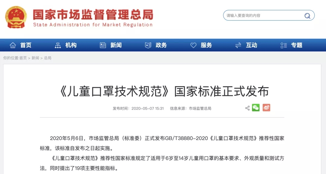 儿童处于生长发育关键时期,需要重点保护,当前市售标称儿童口罩的产品种类繁多、品质良莠不齐,市场监管无标可依,引起了人们的担忧,学龄儿童复学,家长如何为其选择合适的口罩等问题成为了社会关注热点。 2020年5月6日,市场监管总局(标准委)正式发布GB/T 38880—2020《儿童口罩技术规范》推荐性国家标准,该标准发布即实施。