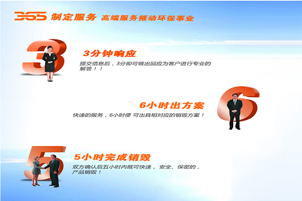 环保365产品销毁中心对客户环保处理物资做到“严格处理、彻底处理、守信处理、环保处理”,减少企业不必要的税务成本,保护了企业的品牌和知识产权,对销毁后的废料进行资源再生利用,为企业带来可观的经济效益,又减少了环境污染,也维护了企业的社会责任形象,实现经济与环保处理过程是严格按照中国环境监察局的指引进行操作,所以在业界树立了良好信誉,业务也在不断发展,合作伙伴的范围也随着扩大,我们已和多家世界制造企业成为长期合作伙伴。不管你是一般销毁还是保密销毁,我们都会为你提供最贴心的服务!