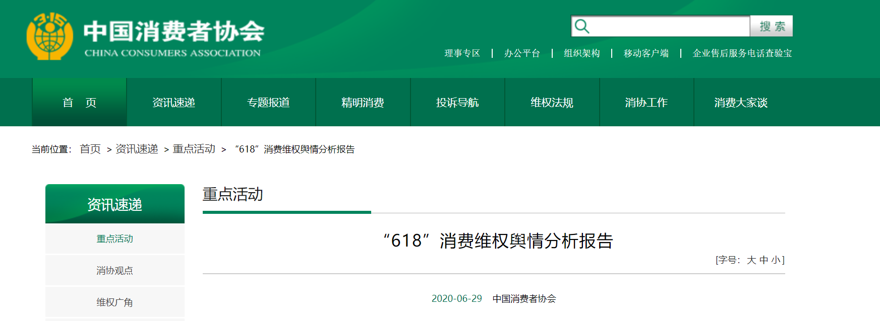 | 中国消费者协会发布“618”消费维权舆情分析报告 |