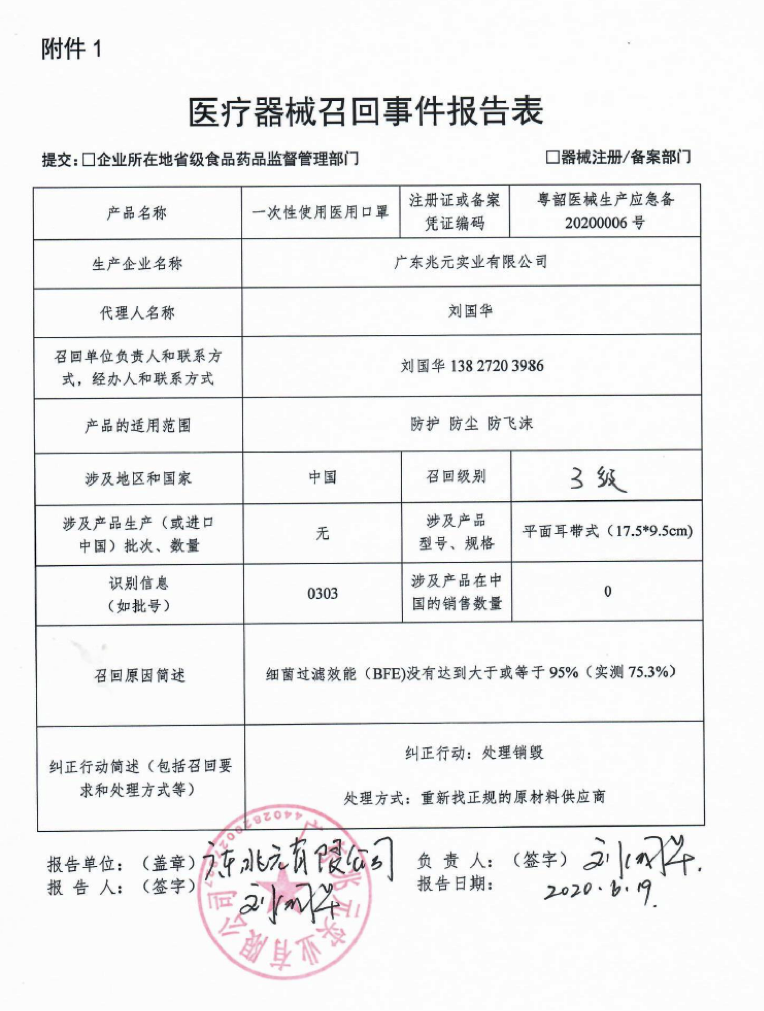 ![]() 广东兆元实业有限公司报告,该公司对其生产的一次性使用医用口罩实施主动召回处理,召回级别为三级,涉及产品的型号、规格及批次等详细信息见《医疗器械召回事件报告表》。