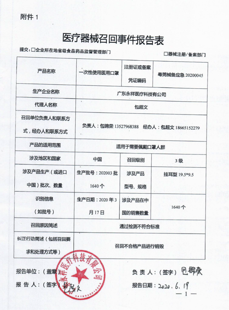 ![]() 广东永祥医疗科技有限公司报告,该公司对其生产的一次性使用医用口罩实施主动召回处理,召回级别为三级,涉及产品的型号、规格及批次等详细信息见《医疗器械召回事件报告表》。