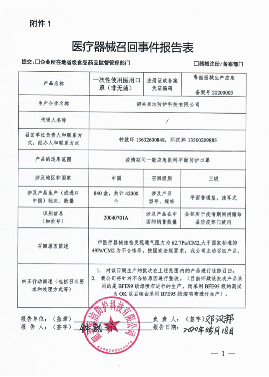 韶关泰洁防护科技有限公司报告,该公司对其生产的一次性使用医用口罩(非无菌)实施主动召回处理,召回级别为三级,涉及产品的型号、规格及批次等详细信息见《医疗器械召回事件报告表》。