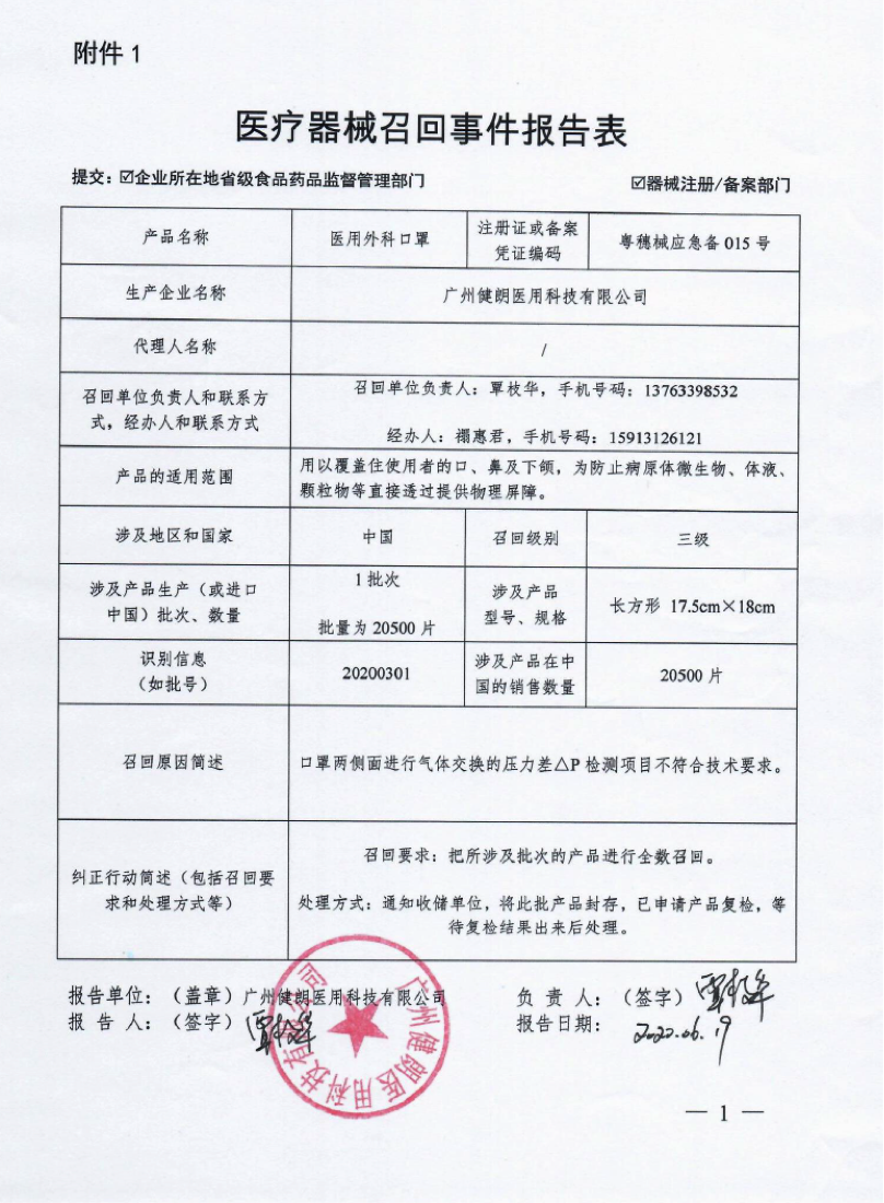 ![]() 广州健朗医用科技有限公司报告,该公司对其生产的医用外科口罩实施主动召回处理,召回级别为三级,涉及产品的型号、规格及批次等详细信息见《医疗器械召回事件报告表》。