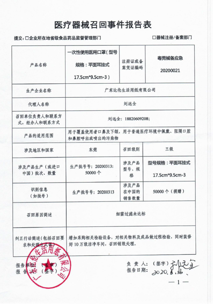![]() 广东比伦生活用纸有限公司报告,该公司对其生产的一次性使用医用口罩实施主动召回处理,召回级别为三级,涉及产品的型号、规格及批次等详细信息见《医疗器械召回事件报告表》。