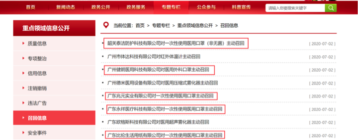 7月2日,广东省药品监督管理局官网发布多则口罩召回信息,涉及5家公司,分别为韶关泰洁防护科技有限公司、广州健朗医用科技有限公司、广东兆元实业有限公司、广东永祥医疗科技有限公司、广东比伦生活用纸有限公司。