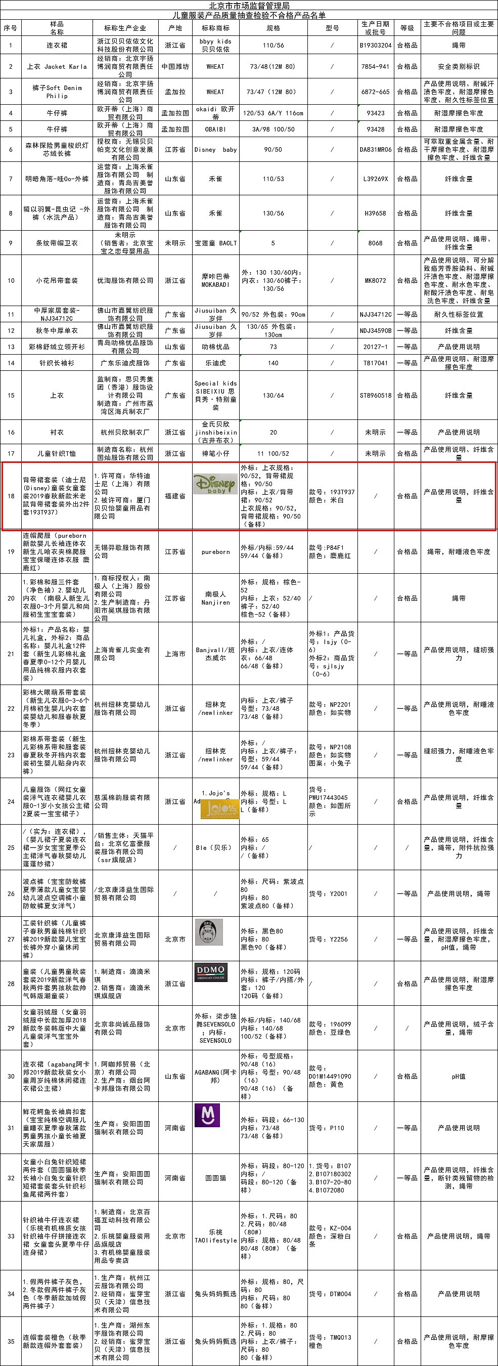 北京市市场监管局提醒消费者,在本次儿童服装产品质量抽查检验中,北京市市场监督管理局发现部分产品存在质量问题且通过产品标称的企业地址及联系方式无法与标称生产企业取得联系,北京市市场监督管理局建议消费者谨慎购买下列标称企业的产品,具体名单如下: