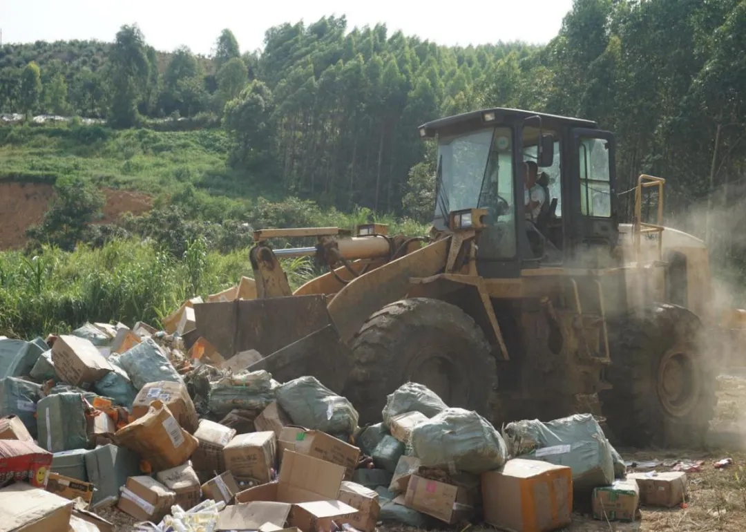 销毁活动在鹿寨镇龙田村龙坪屯垃圾填埋场进行,销毁的产品主要是近三年来原鹿寨县食药监局和原鹿寨县工商质监局在行政执法中没收的假冒伪劣或超过保质期的食品、化妆品和假冒伪劣农资化肥约40吨,货值金额约135万元产品,所有产品均在相关工作人员的监督下进行碾压填埋处理。