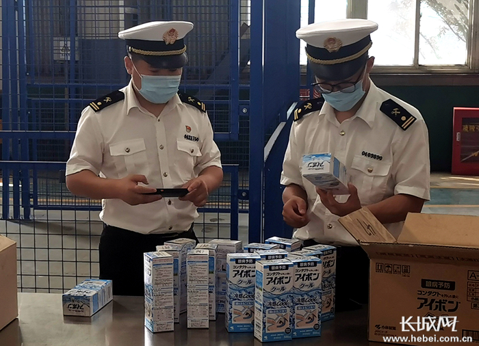 图为京唐港海关关员靳帅(左一)、宁凯旋(左二)对需销毁跨境商品进行盘点。