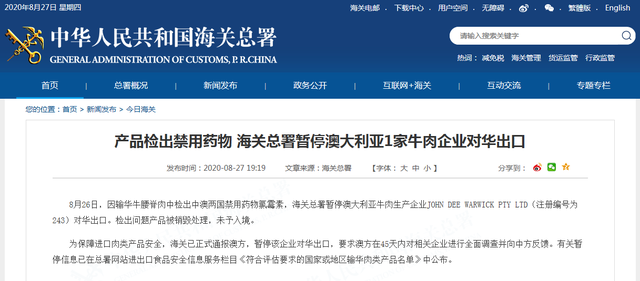 | 澳大利亚一肉企输华产品被检出禁药!海关总署:问题产品已销毁处理 |