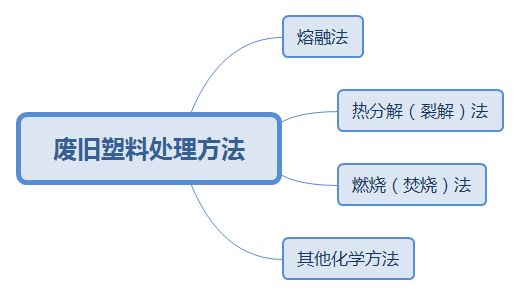 废旧塑料一般有如下几种处理方法来实现资源化回收利用: (1)熔融法,即将废旧塑料重新熔融塑化成产品。 (2)热分解(裂解)法,即将废旧塑料分选后加热分解成燃料油或燃料气。这种工艺复杂,处理费用高。 (3)燃烧(焚烧)法,即将废旧塑料燃烧回收热量。这种产生的烟气会造成二次污染。 (4)其他化学方法,主要用于获取化工原料。