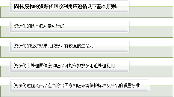 固体废物的资源化回收利用应遵循以下基本原则: • 资源化的技术必须是可行的; • 资源化的经济效果比较好,有较强的生命力; • 资源化所处理固体废物应尽可能在排放源附近处理利用; • 资源化过程及产品应当符合国家相应环境保护标准及产品的质量标准。