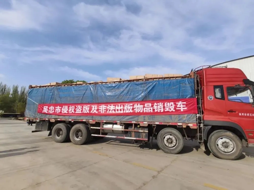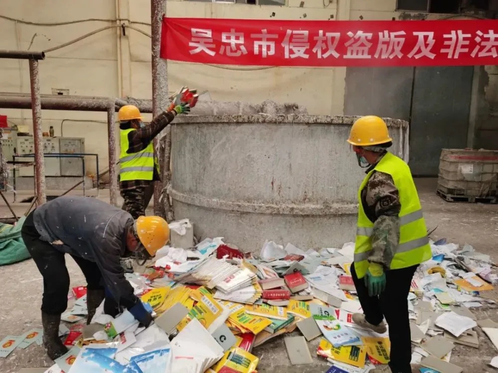 4月22日,在吴忠市源盛纸业有限公司内,吴忠市对3.5万册侵权盗版及非法出版物进行集中销毁。 此次活动集中销毁的是吴忠市“扫黄打非”领导小组及成员单位收缴的非法书籍,是吴忠市迎接“4·26”世界知识产权日,展示“扫黄打非”成果的一次具体行动,是彰显吴忠市打击非法侵权盗版及非法出版活动、保护知识产权立场和决心的一次实际行动,也是对违法经营犯罪分子和非法经营者的一次警示、震慑活动,对于进一步推动吴忠市文化新闻出版市场健康、有序、快速发展具有重要的意义。