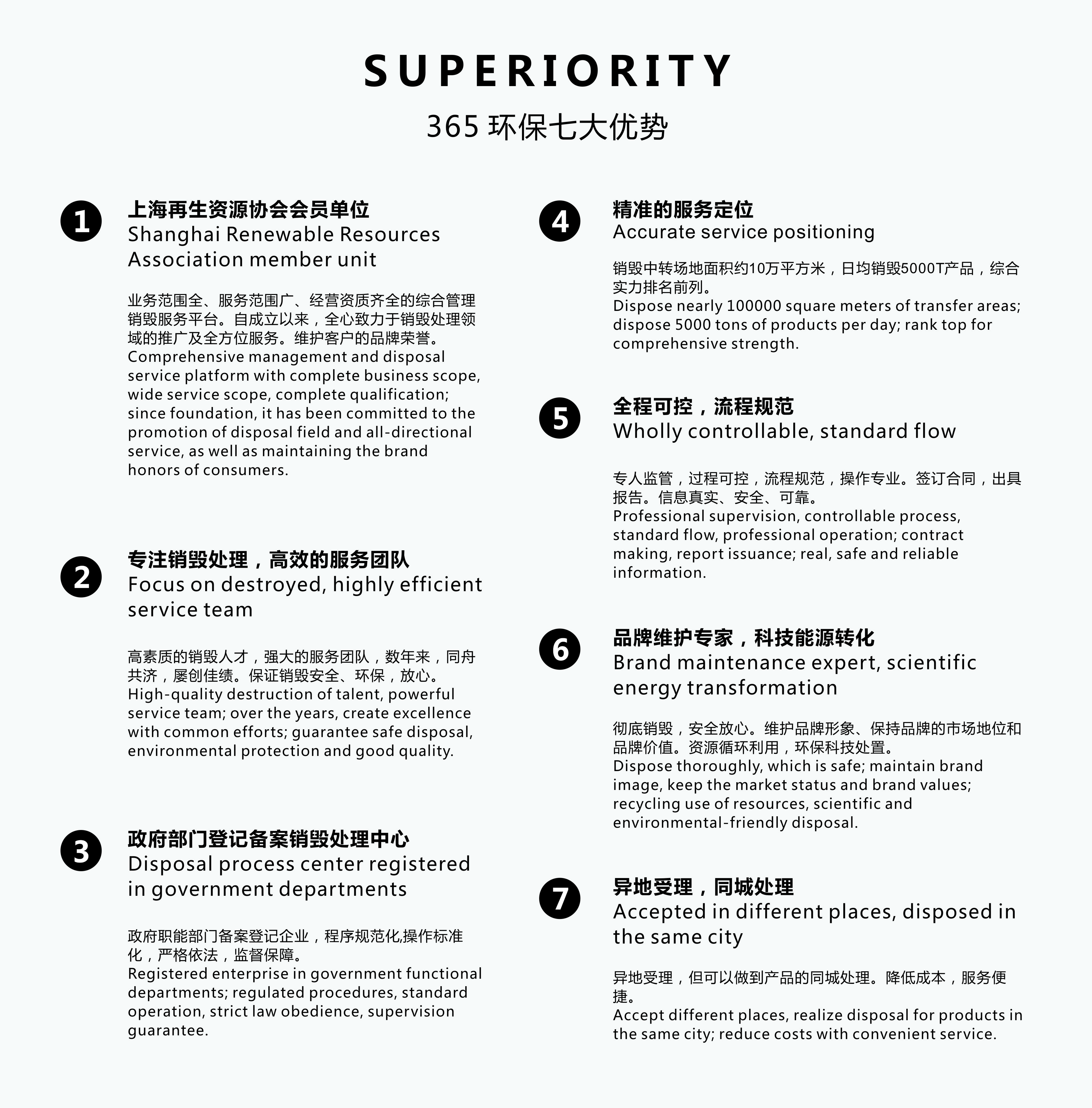 环保365产品销毁中心隶属三六五(上海)废弃物处理服务中心,行政审批经营范围:从事一般工业废弃物及报废产品销毁处理服务,专业提供咨询处理海关查收、安检工商查获、假冒伪劣、质监局、检验检疫局、偷税、质量问题、过期产品、生产企业报废、不合格产品、伪劣物品等产品报废销毁处理方案。 三六五销毁平台运作及服务中心设立在中国上海,目前分别在北京、天津、福州、广州、山东、南京、苏州、无锡、常州、武汉、四川成都、重庆、沈阳等地陆续成立分部。365产品报废销毁处理中心主要是为了配合国家环保相关部和工业、安全生产、海关、工业信息化、质量管理、安检、工商等部门针对缺陷产品及不合格产品、过期产品、假冒伪劣产品、质量问题、变质产品、产品的销毁处理能得到规范、安全环保处置提供一站式产品报废销毁处理服务,以促进“节能减排、无害化处置、循环经济、绿色生产的理念,保护消费者合法权益,维护企业市场品牌荣誉。” 服务对象有贸易公司、进出口公司、奢侈品、退港货物、研发机构、样品检测、代加工企业、高科技领域、汽车配件生产企业、食品加工生产公司、五金配件加工企业、档案人事科、电子制造、电器生产、芯片加工、涉密载体、通信设备、图纸设计公司、服装贸易公司、服装加工企业等行业提供报废产品的收集、分类、运输、销毁处置一站式服务。 销毁处理中心进行资源整合的平台下独资与合资环保企业共15余家,联盟机构和环保公司23家,在本地区业务范围齐全、回收管理服务范围广、经营资质齐全的综合管理服务平台。有环保工程师和专业回收人员350余名,他们在业务开展中所持的资质有:A.企业法人营业执照 B.上海市、北京市、广州市、四川成都市等市危险废物经营许可证 C.生产性废旧金属收购许可证 D.ISO14000环境管理体系 E.OHSAS18000职业健康和安全管理体系F.环境污染治理设施运营许可证等资质。 报废销毁处理场所及设备:产品销毁中转站40余亩,运输车辆36辆、压缩车机30台、切割电锯1台、大型推土机3辆、切割机设备3台、粉碎机设备5台、打包压缩机1台、焚烧炉、焚烧站3处。
