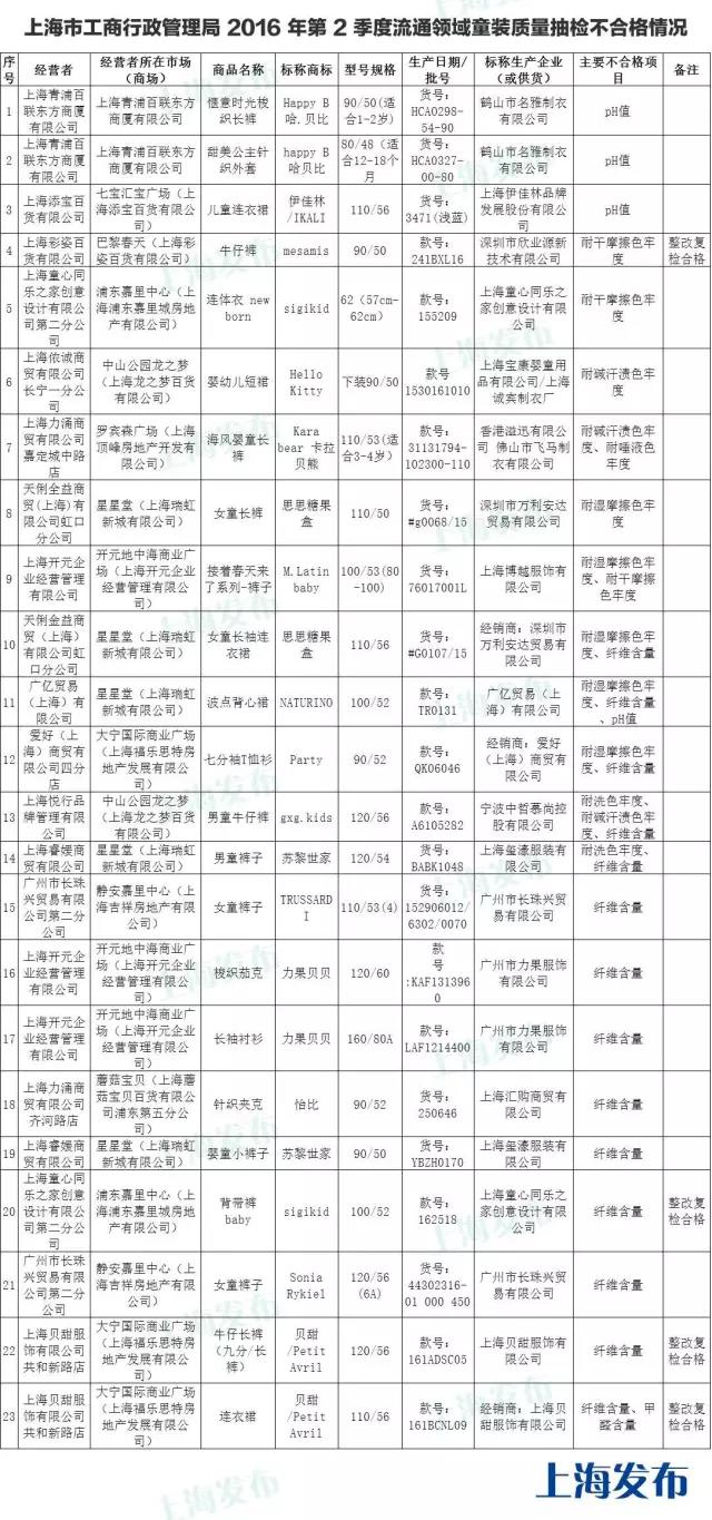 市工商局今天发布,对虹口、静安、长宁等10个区的17家商场销售的55个品牌110个批次儿童服装进行了市场检查和质量抽检。经检测,上海青浦百联东方商厦的HappyB 哈贝比长裤、大宁国际商业广场的Party牌T恤衫等23批次不合格,涉及甲醛含量、PH值、色牢度、纤维含量等。详见下表