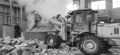 ![]() 铲车正在将卡牌倒入打浆机中