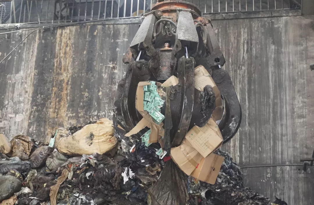 ![]() 在销毁现场,可以看到,等待销毁的物品码放整齐,既有各种被查扣的不合格食品,也假冒食品,还有制售假劣食品所使用的包装材料等。工作人员驾驶叉车将物品一一运送至焚烧坑,巨大的吊钩抓起一堆堆待销毁品缓缓上升至焚烧炉顶部,将这些物品全部送入焚烧炉进行焚烧。