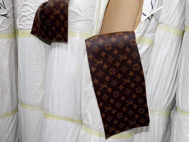 假冒、高仿“LV”、“GUCCI”等奢侈品包具你可能见过,但你不一定见过成卷的印有奢侈品包具花纹的生产皮料。