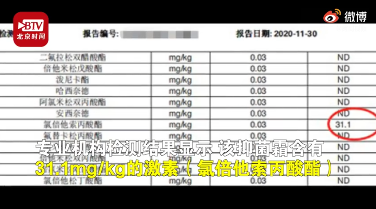 专业机构检测结果显示该抑菌霜含有激素成分