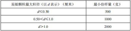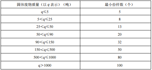 4.2.2堆存状态的固体废物,应以堆存的固体废物总量为依据,按照表 1 确定需要采集的最小份样数。 4.2.3生产工艺过程中产生的固体废物,以生产设施自试生产以来的实际最大生产负荷时的固体废物产生量为依据,按照表 1 确定需要采集的最小份样数。满足第 4.1.2 条规定的固体废物,以固体废物产生量最大的单条生产线最大产生量为依据,按照表 1 确定需要采集的最小份样数。固体废物产生量根据以下方法确定: a)连续产生固体废物时,以确定的工艺环节一个月内的固体废物产生量为依据,按照表 1 确定需要采集的最小份样数。如果连续产生时段小于一个月,则以一个产生时段内的固体废物产生量为依据。 b)间歇产生固体废物时,如固体废物产生的时间间隔小于或等于一个月,应以确定的工艺环节一个月内的固体废物最大产生量为依据,按照表 1 确定需要采集的最小份样数。如固体废物产生的时间间隔大于一个月,以每次产生的固体废物总量为依据,按照表 1 确定需要采集的最小份样数。 4.2.4以下情形固体废物的危险特性鉴别可以不根据固体废物的产生量确定采样份样数: a)鉴别样品为本标准第 4.1.3 条 a)例所规定的物质,可适当减少采样份样数,份样数不少于2 个。固体废物为 4.1.7 条所规定的废弃包装物、容器时,内容物的采样参照本条执行。 b)固体废物为废水处理污泥,如废水处理设施的废水的来源、类别、排放量、污染物含量稳定,可适当减少采样份样数,份样数不少于 5 个。 c)固体废物来源于连续生产工艺,且设施长期运行稳定、原辅材料类别和来源固定,可适当减少采样份样数,份样数不少于 5 个。 d)贮存于贮存池、不可移动大型容器、槽罐车内的液态废物,可适当减少采样份样数。敞口贮存池和不可移动大型容器内液态废物采样份样数不少于 5 个;封闭式贮存池、不可移动大型容器和槽罐车,如不具备在卸除废物过程中采样,采样份样数不少于 2 个。 e)贮存于可移动的小型容器(容积≤1000L)中的固体废物,当容器数量少于根据表 1 所确定的最小份样数时,可适当减少采样份样数,每个容器采集 1 个固体废物样品。 f)固体废物非法转移、倾倒、贮存、利用、处置等环境事件涉及固体废物的危险特性鉴别,因环境事件处理或应急处置要求,可适当减少采样份样数,每类固体废物的采样份样数不少于 5 个。 g)水体环境、污染地块治理与修复过程产生的,需要按照固体废物进行处理处置的水体沉积物及污染土壤等环境介质,以及突发环境事件及其处理过程中产生的固体废物,如鉴别过程已经根据污染特征进行分类,可适当减少采样份样数,每类固体废物的采样份样数不少于 5 个。 4.3 份样量的确定 4.3.1固态废物样品采集的份样量应同时满足下列要求: a)满足分析操作的需要; b)依据固态废物的原始颗粒最大粒径,不小于表 2 中规定的质量。 表 2 不同颗粒直径的固态废物的一个份样所需采集的最小份样量